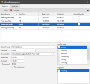 Die Abrechnungsarten definieren ein Modell an welchen Tagen zu welcher Uhrzeit eine Berechnung berücksichtigt wird. Es können beliebige viele Abrechnungsarten erstellt werden. Diese werden in den Abrechnungsmodellen den jeweiligen Positionen zugewiesen.