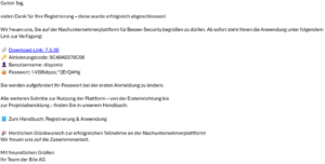 Nach erfolgter Registrierung und durchgeführter Einrichtung werden die Zugangsdaten für DISPONIC One dem angegebenen E-Mail-Adressaten von der Absende-Adresse nachunternehmer@disponic.de zugestellt.