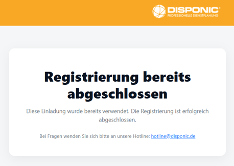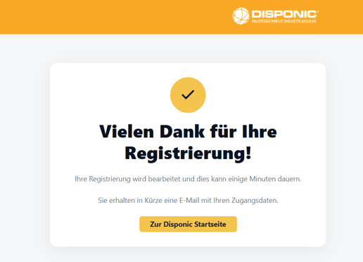 Mit Abschluss der Registrierung wird die DISPONIC Umgebung erstellt. Dieser Vorgang kann einige Zeit in Anspruch nehmen. Nach Fertigstellung werden die Zugangsdaten an die angegebene E-Mail-Adresse des Ansprechpartners bereitgestellt.