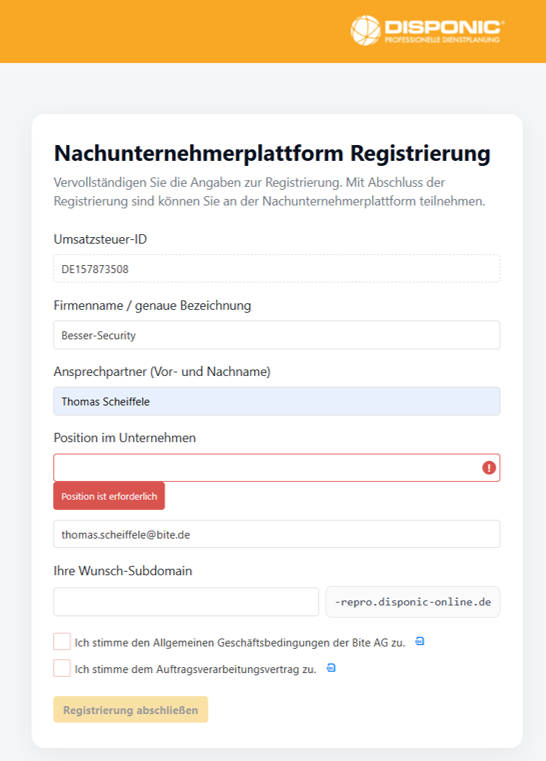 Wird auf der Plattform keine Umsatzsteuer-ID gefunden, so wird eine E-Mail an den angegebenen Ansprechpartner mit der Bitte um eine Teilnahme an der Nachunternehmer-Plattform gesendet. Die Absende-Adresse ist nachunternehmer@disponic.de.