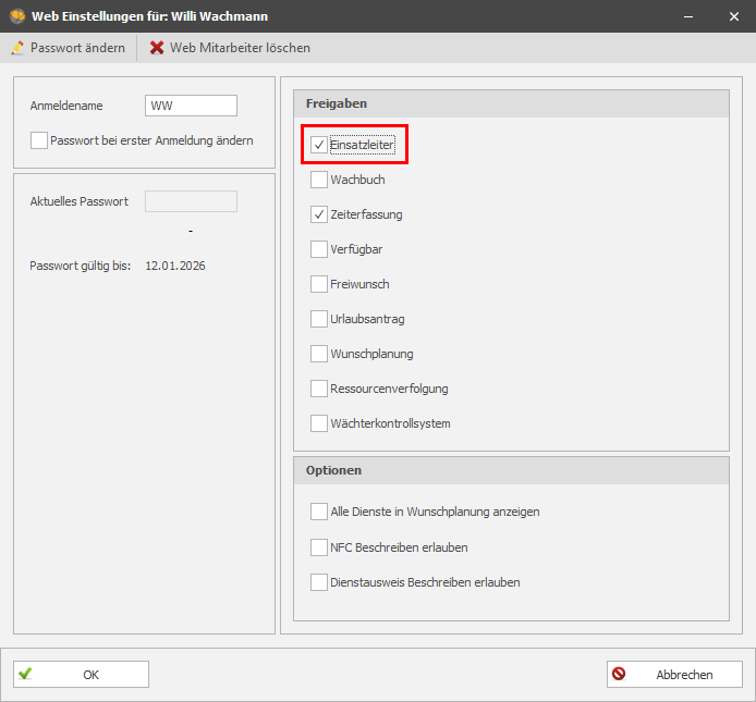 - Mitarbeiter sind als Objektleiter eingetragen oder als Einsatzleiter berechtigt und haben einen Web-Zugang (siehe Stammdaten/Mitarbeiter/Webeinstellungen).