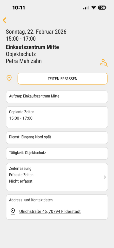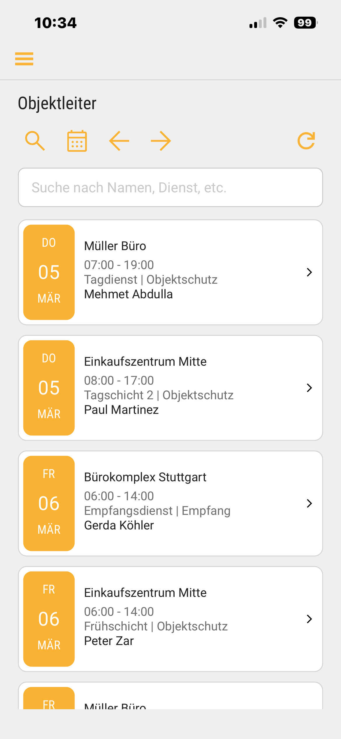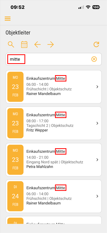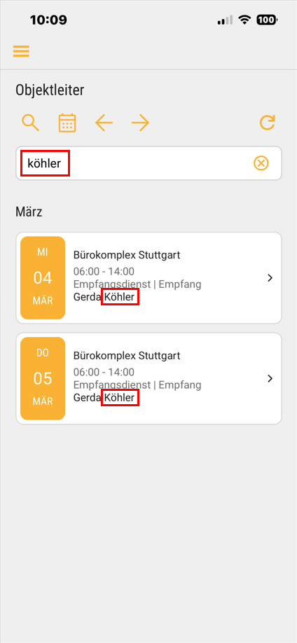 • Objektleiter bekommen die Dienste von Mitarbeitern angezeigt, die ihren Objekten (d. h. Aufträgen) geplant sind.