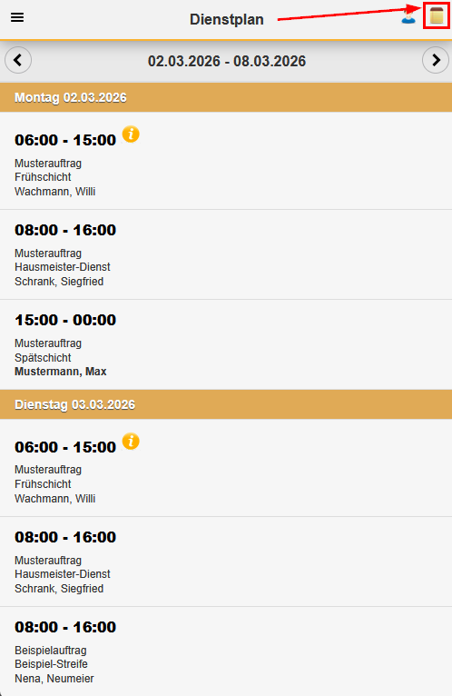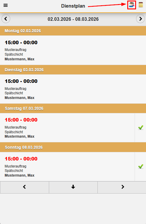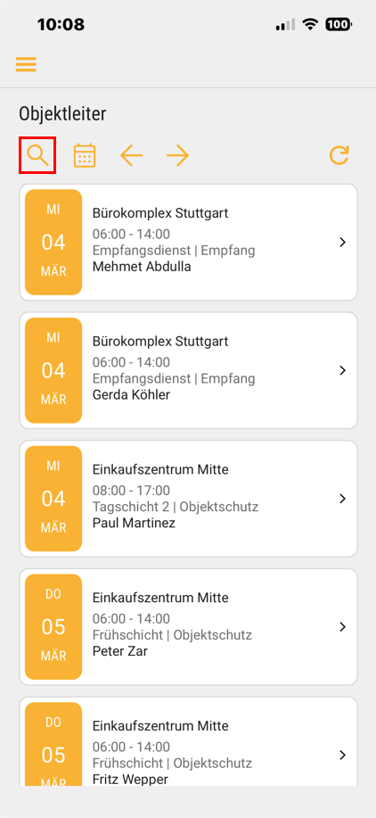 Zum Umschalten vom eigenen Dienstplan auf die Objekt-/Einsatzleiter-Sicht muss auf das Icon mit mehreren Personen oben rechts getippt werden.