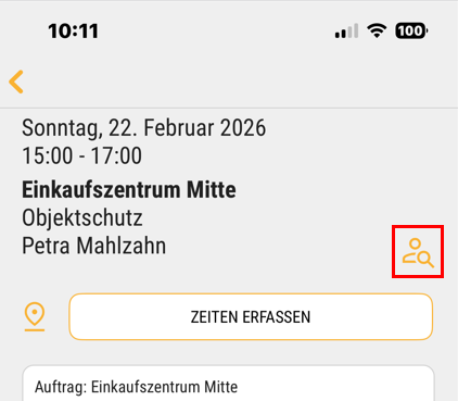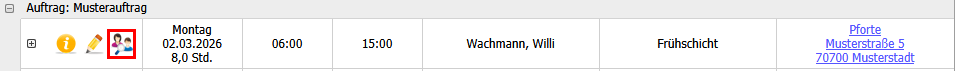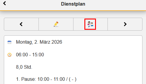 Sofern im Web Portal freigeben, können Objekt- und Einsatzleiter in Diensten geplante Mitarbeiter tauschen, wenn für den ursprünglich geplanten Mitarbeiter noch keine Zeiten erfasst wurden. In der mobilen (d. h. Smartphone-optimierten) Ansicht von DISPONIC web muss dazu erst der jeweilige Dienst geöffnet werden. Über den Details zum zum Dienst gibt es dazu ein Symbol: Dieses besteht aus einer Lupe und zwei Personen. Es ist dann sichtbar, wenn der Tausch zur Verfügung steht.