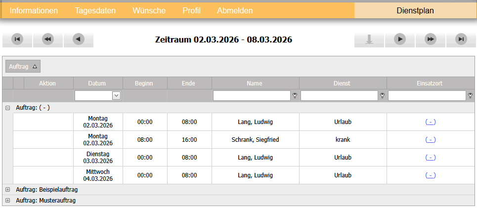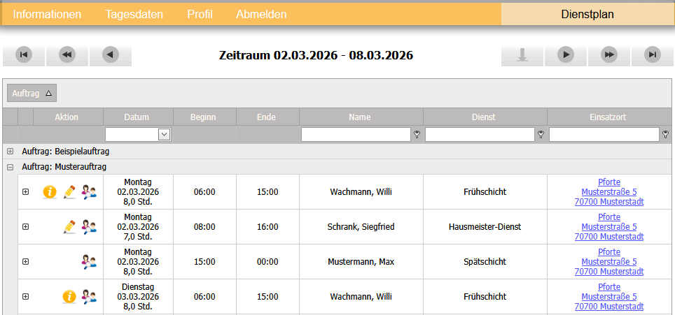 Es gibt außerdem die Möglichkeit, statt allen Diensten nach Zeitplan die Dienste zusammengefasst nach Aufträgen anzeigen zu lassen. Auch hierfür gibt es ein Icon oben rechts.
