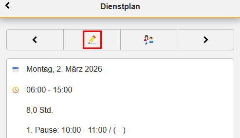 Sofern im Web Portal freigeben, können Objekt- und Einsatzleiter die Zeiten für andere Mitarbeiter eintragen. In der mobilen (d. h. Smartphone-optimierten) Ansicht von DISPONIC web muss dazu erst der jeweilige Dienst geöffnet werden. Über den Details zum zum Dienst gibt ein Stift-Symbol, wenn sich der Dienst in dem für die Zeiterfassung freigegebenen Zeitraum (siehe Web Portal) befindet.