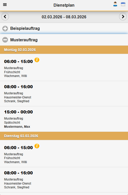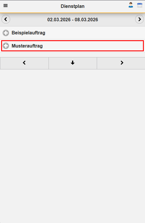 Bei der nach Aufträgen sortierten Ansicht kann der Auftrag mit Antippen der Zeile jeweils aufgeklappt werden, um die Dienste im ausgewählten Zeitraum anzuzeigen. Bei Einsatzleitern werden unter „Auftrag: ( – )“ die Abwesenheiten zusammengefasst.