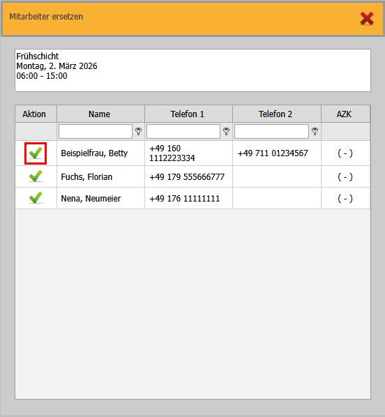 Der Klick auf das Symbol öffnet das Fenster „Mitarbeiter ersetzen“. Um einen Mitarbeiter austauschen zu können, muss hier zuerst ein Ersatz ausgewählt werden. Es werden bis zu zwei hinterlegte Telefonnummern von Mitarbeitern angezeigt, falls Sie diese vorher anrufen möchten.