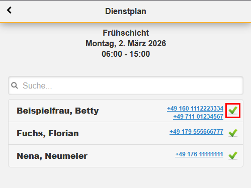 Über das Symbol öffnet man Suchfunktion. Um einen Mitarbeiter austauschen zu können, muss hier zuerst ein Ersatz ausgewählt werden. Es werden bis zu zwei hinterlegte Telefonnummern von Mitarbeitern angezeigt, falls Sie diese vorher anrufen möchten.